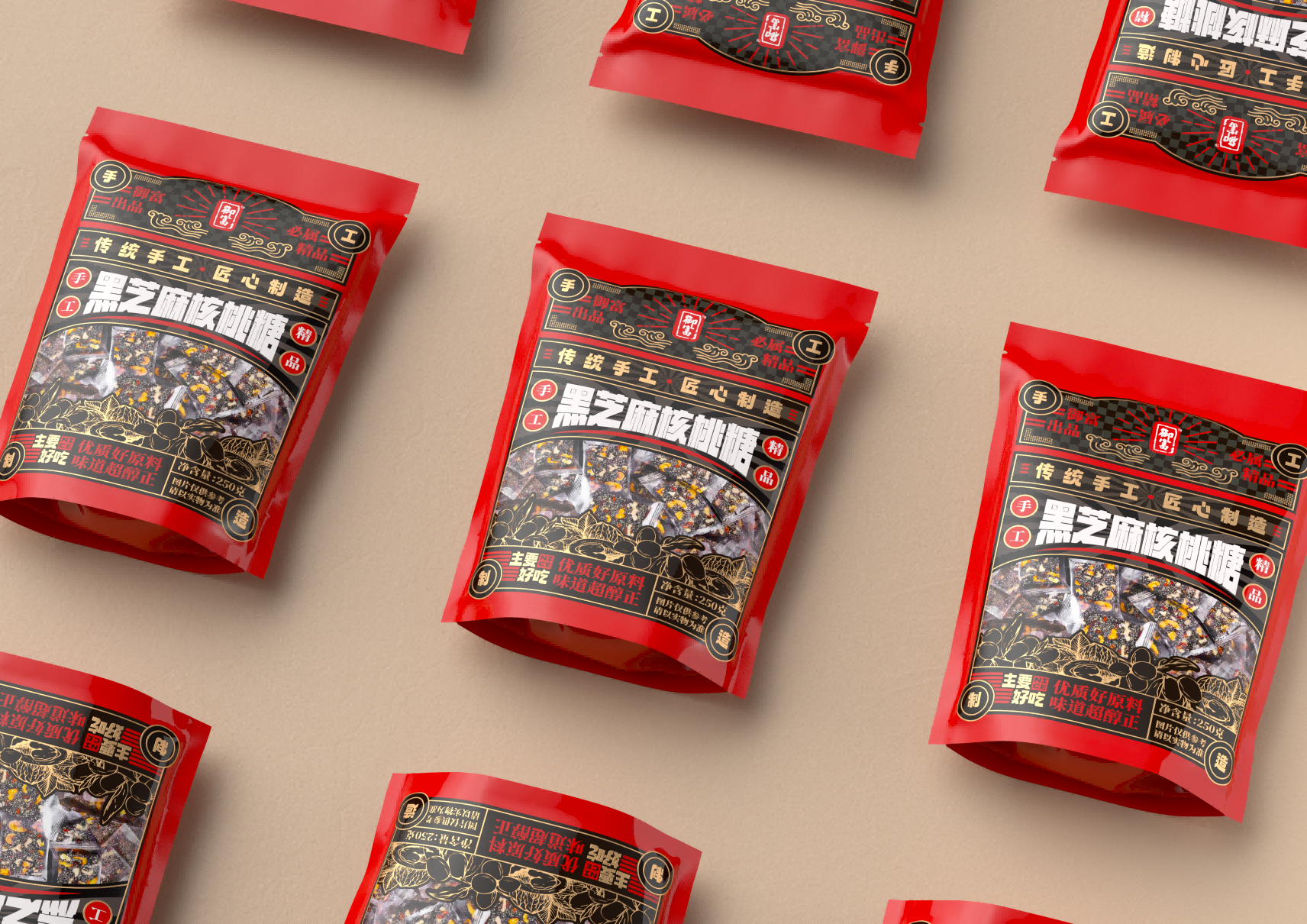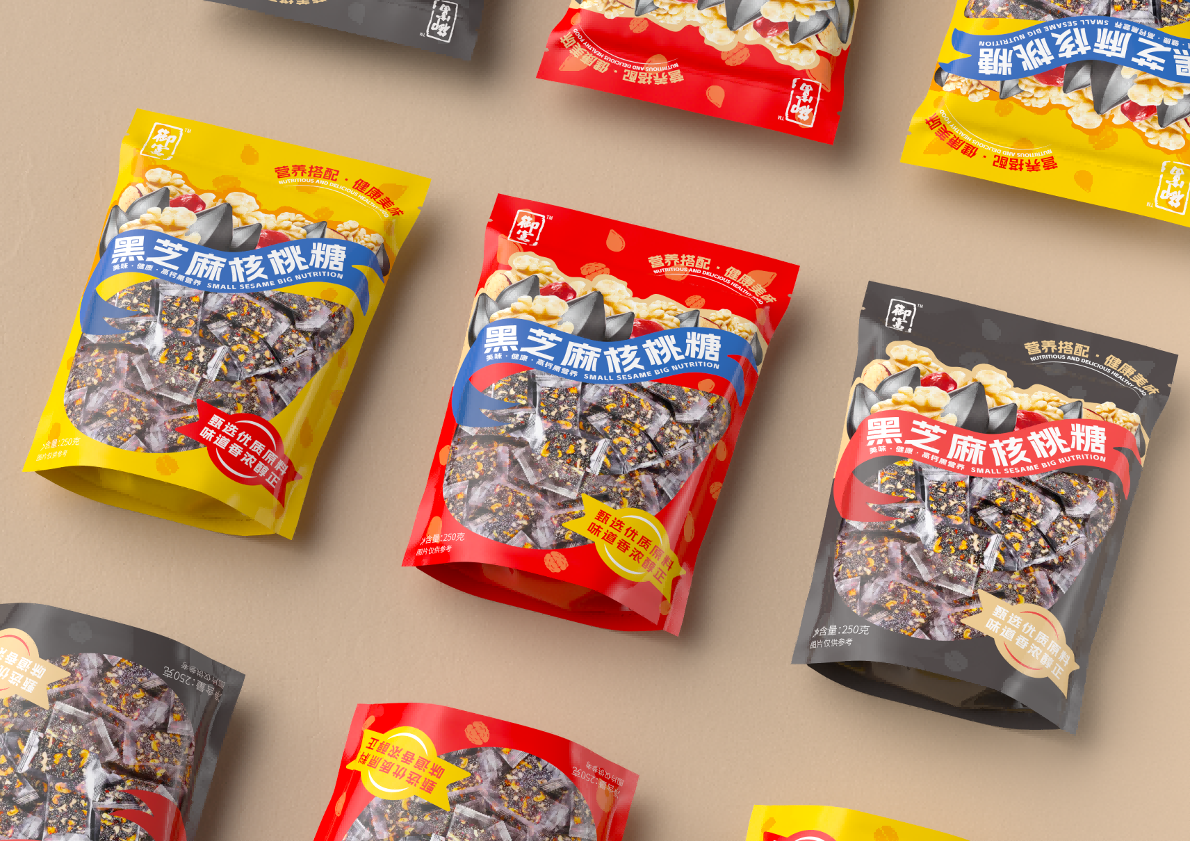這款黑芝麻紅棗核桃糖的包裝設(shè)計,從色彩的運用到文字的排列,每一處細節(jié)都體現(xiàn)了設(shè)計師的巧妙構(gòu)思和精心打磨。我們將一起探索這款包裝背后的設(shè)計故事,感受設(shè)計師是如何通過色彩與文字的巧妙結(jié)合,將這款糖果打造成市場上一道獨特的視覺盛宴。首先,這款包裝在色彩的選擇上極為考究。黑芝麻、紅棗和核桃的自然色彩被巧妙地融入到包裝設(shè)計中,形成了一種溫暖而誘人的視覺效果。設(shè)計師巧妙地運用了這些食材的本色,不僅傳達了產(chǎn)品的健康理念,同時也給人以視覺上的舒適感和食欲刺激。其次,包裝上的文字布局同樣值得稱道。字體的選擇、大小的安排以及排版的布局,都經(jīng)過了精心的設(shè)計,旨在傳達出產(chǎn)品的核心價值和品牌理念。文字與圖案的和諧統(tǒng)一,不僅增強了包裝的可讀性,也提升了整體的美觀度。